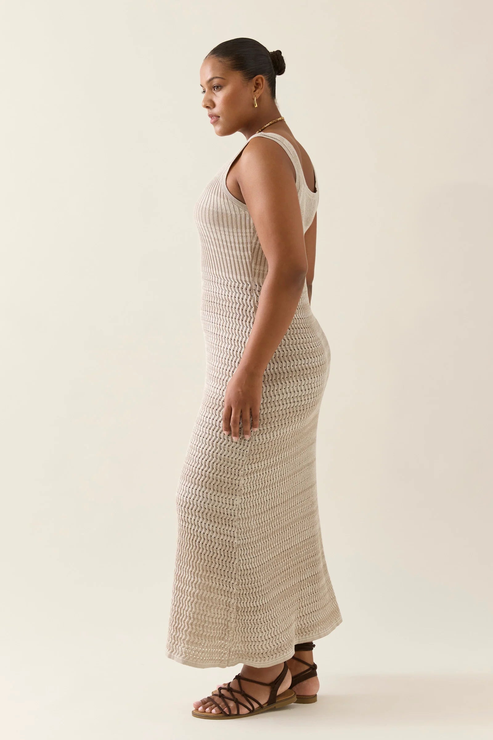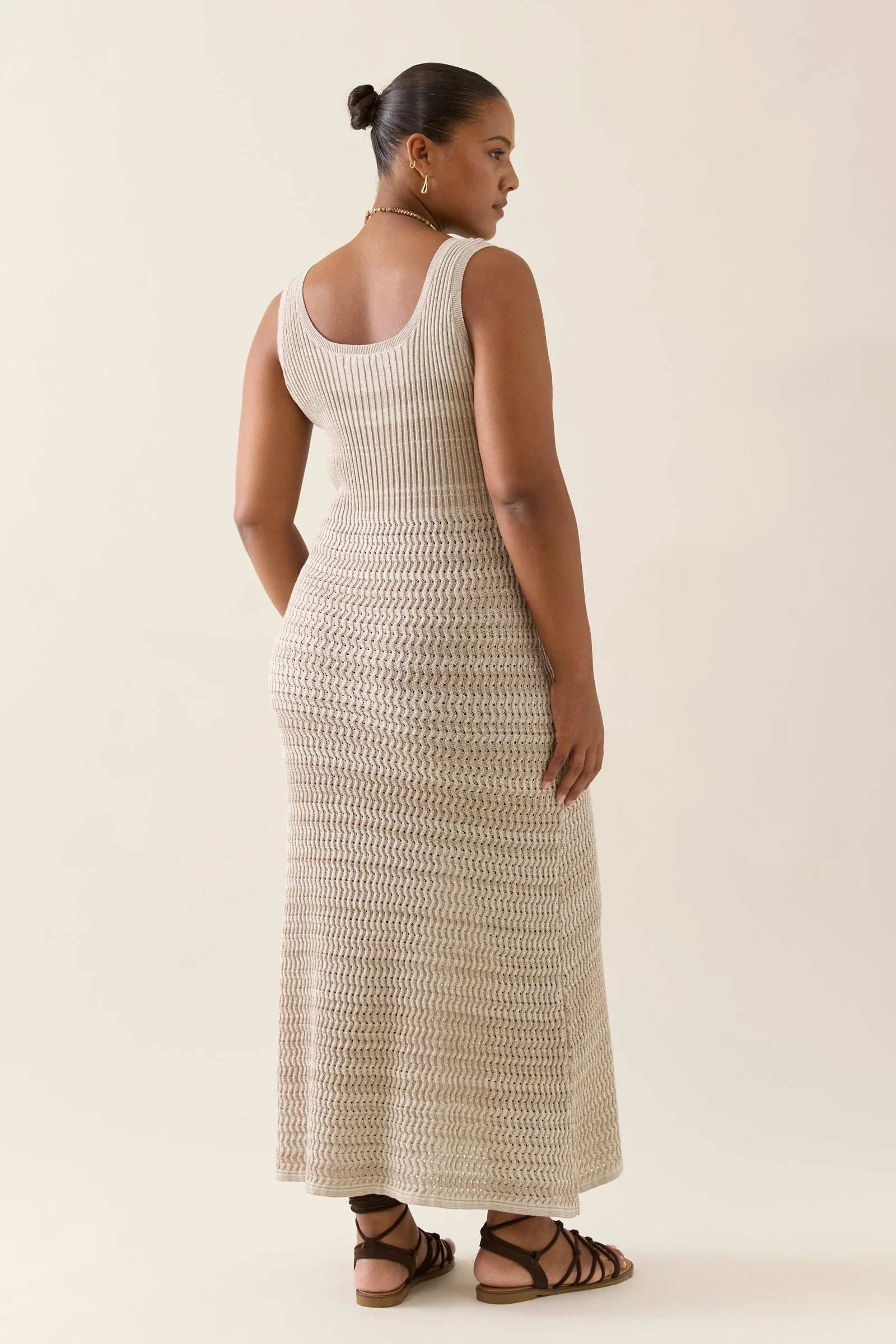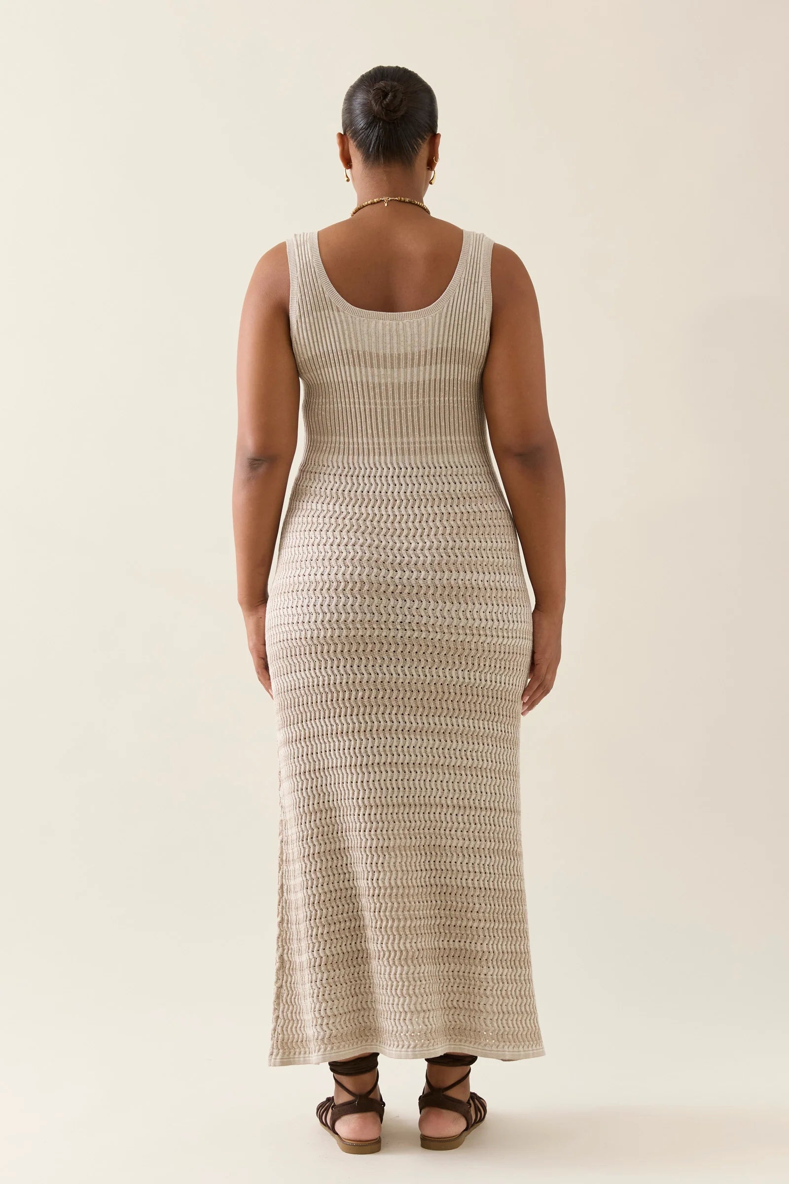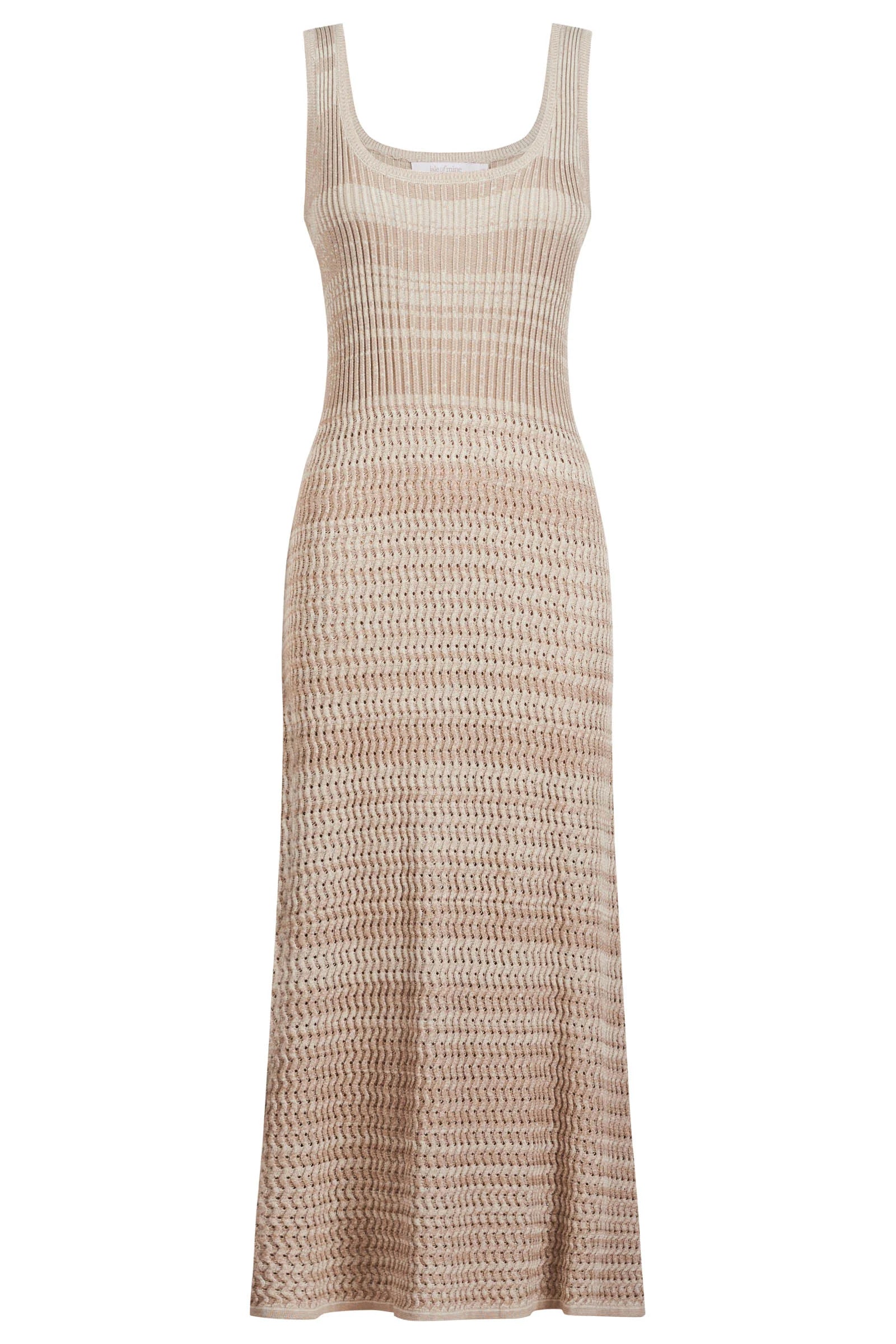 A textural pointelle-knit dress crafted from 100% cotton. This 7/8-length dress features mixed two-tone woven fibres for visual depth, a rounded neckline, and a softly flared mermaid-style hem. This dress offers subtle glimpses of skin.