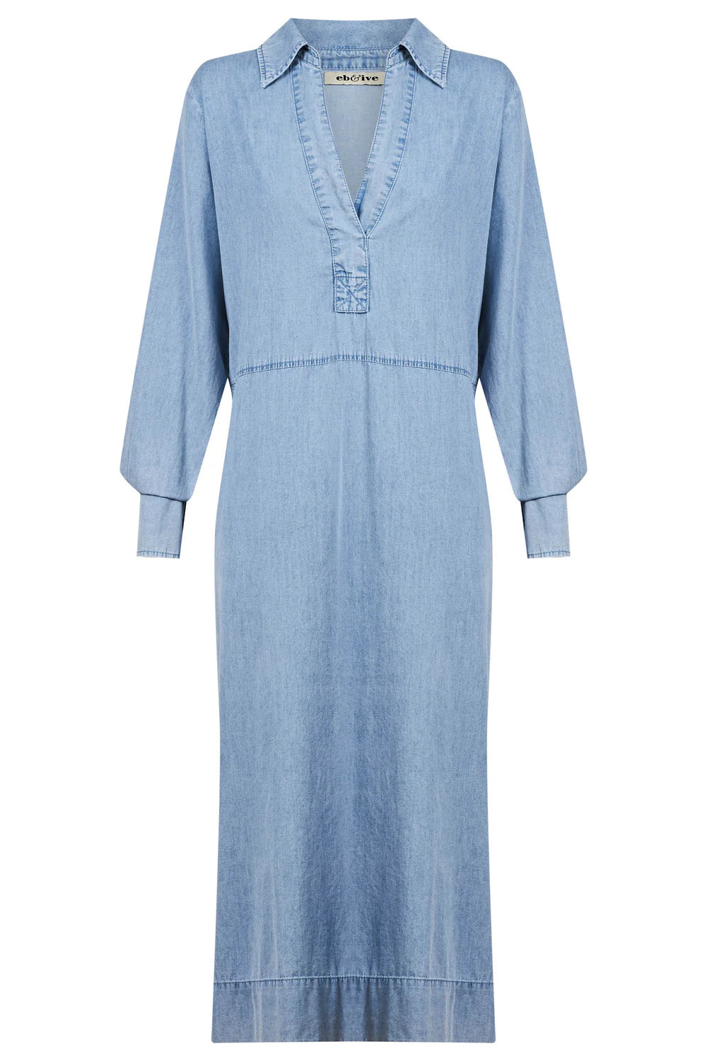 A beautifully soft and lightweight chambray mid-length dress with relaxed elegance. Crafted from 100% cotton to create an effortless denim look. Features a classic collar, seam detail under bust, long sleeves with wood button cuff, side splits, functional pockets, and wide cuff hem.