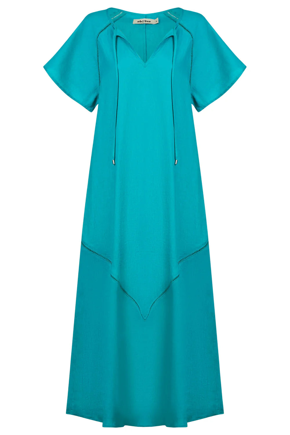 A timeless maxi designed for summer occasions. Crafted from 100% linen for breathable comfort. Features ladder lace trim on front panels and shoulders, ties at the neckline, and a softly tapered waist that flows to a slight A-line silhouette.