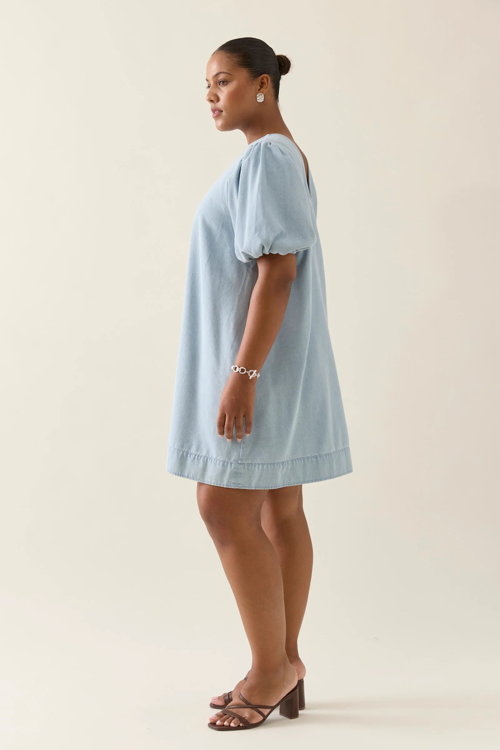 A refined staple that combines comfort with structured style. Made from lightweight denim, this dress features a round neckline, puff sleeves and side seam pockets. A scooped back and topstitched wide hem complete the silhouette.