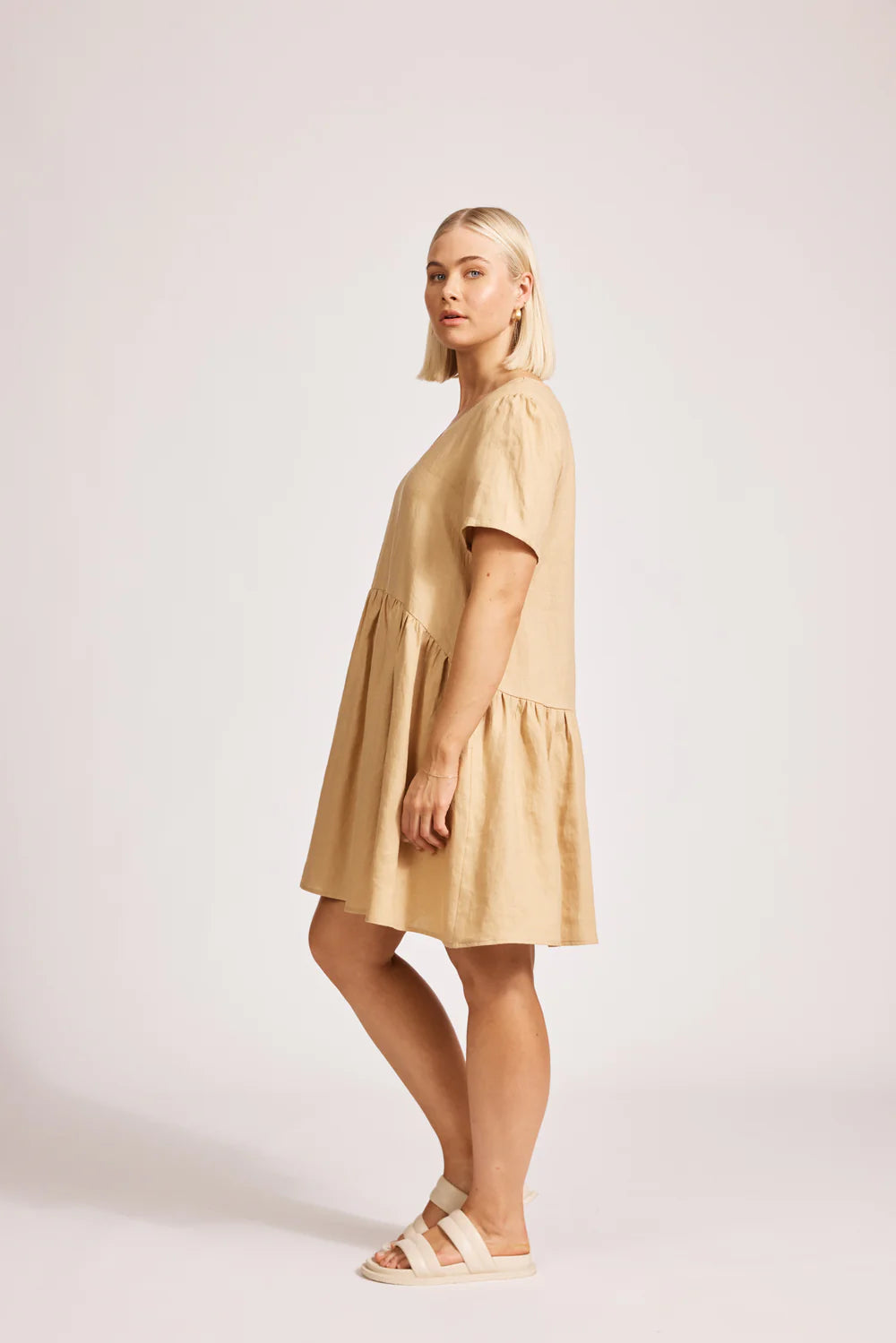 A relaxed midi dress for easy summer style and versatility. Crafted from 100% Linen for breathable comfort. Features a V neckline, short sleeves, drop diagonal waistline, and functional pockets.