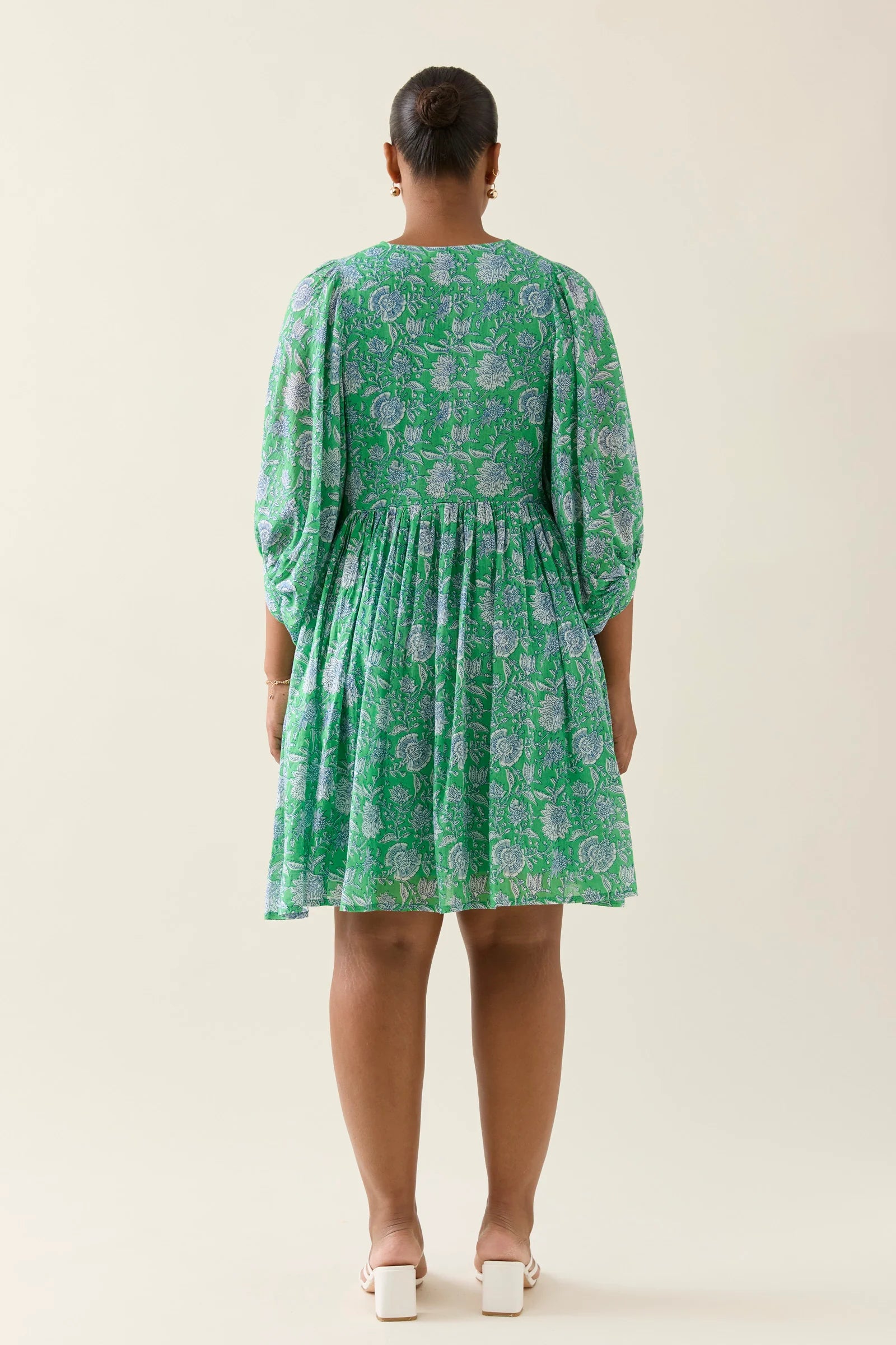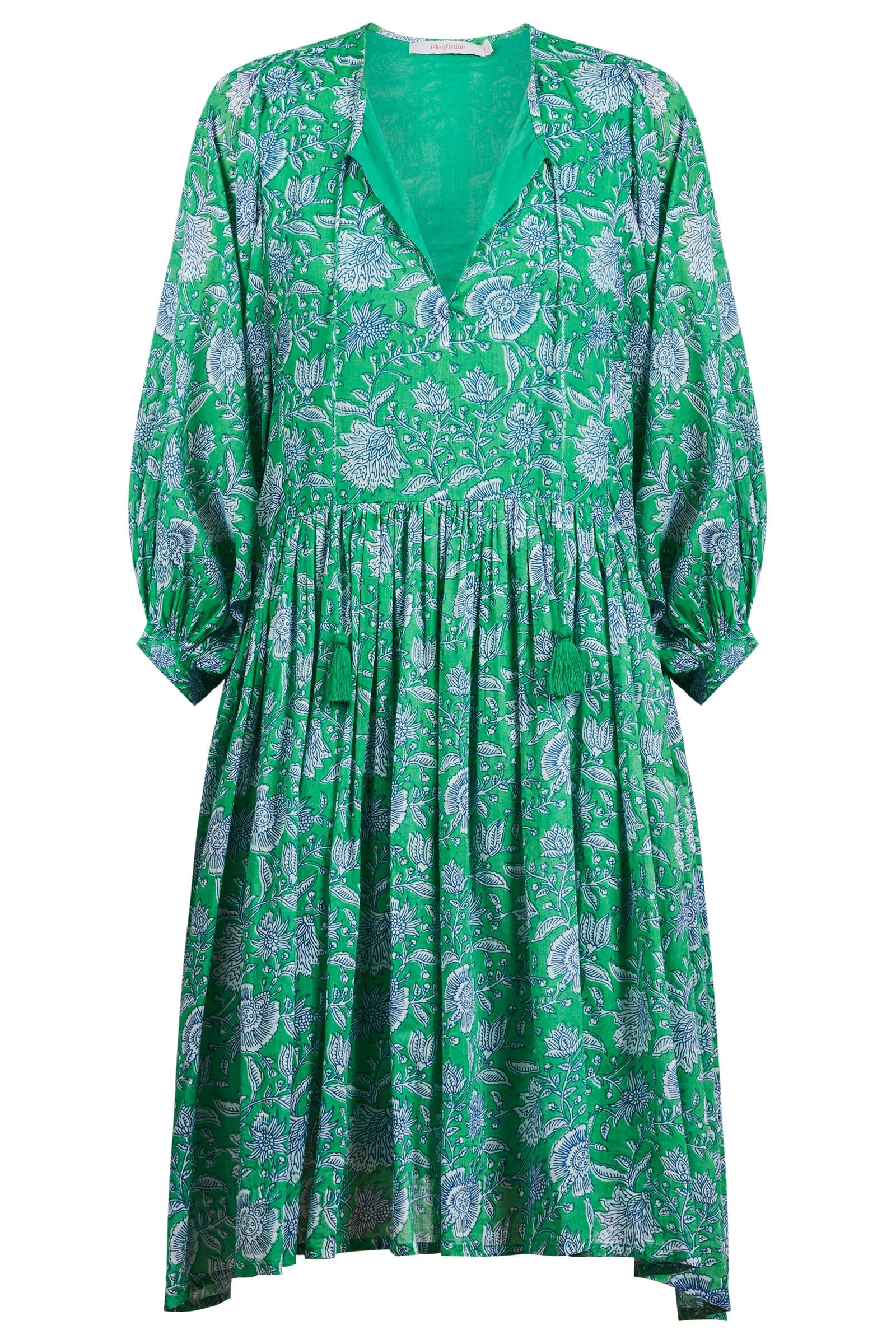 The Wilma Dress is crafted from lightweight cotton voile, hand screen printed for a one-of-a-kind look. Inspired by floral hand-block, and featuring a V-neckline with tassel ties, a gathered waist, 3/4 sleeves. Fully lined for comfort and ready to wear. Throw on with sandals for a walk by the beach or dress up with earrings and wedges for an afternoon in the sun.